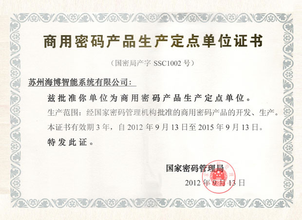 恭喜苏州海博智能系统有限公司获得国密局商用密码产品生产定点单位证书