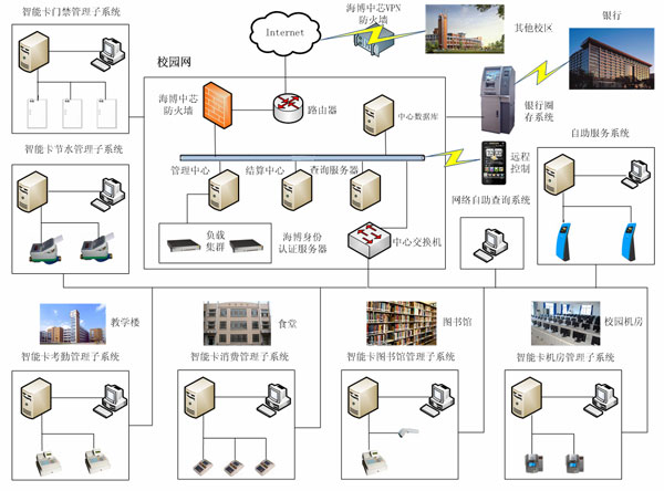 4、子系统应用包括:智能卡门禁管理子系统,智能卡节水管理子系统,智能卡考勤管理子系统,智能卡消费管理子系统,智能卡图书管理子系统,智能卡机房管理子系统,网络自助查询系统,自助服务系统;