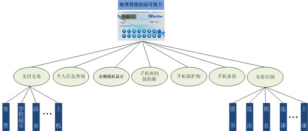 海博智能校园可视卡主要功能包括支付交易、个人信息查询、余额脱机查询、手机密码保险箱、手机“保护狗”、手机备份、身份识别等功能。如下图: